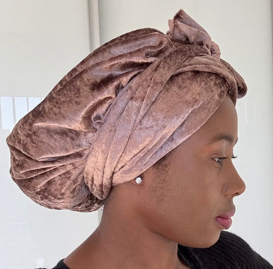 Turban ajustable en velours marron et satin "Ebène" - Taille standard
