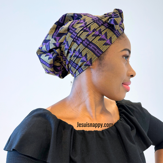 Turban en satin et wax violet "Fulani" ajustable - Taille standard